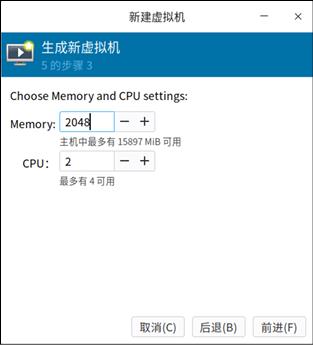 在图2-18所示的对话框中,输入内存(Memovy)和CPU的核数,单击“前进”,进入图2-19所示的对话框。
