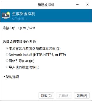 进入图2-16所示的对话框后,选择“本地安装介质(ISO映像或者光驱)”,单击“前进”,进入图2-17所示的对话框。