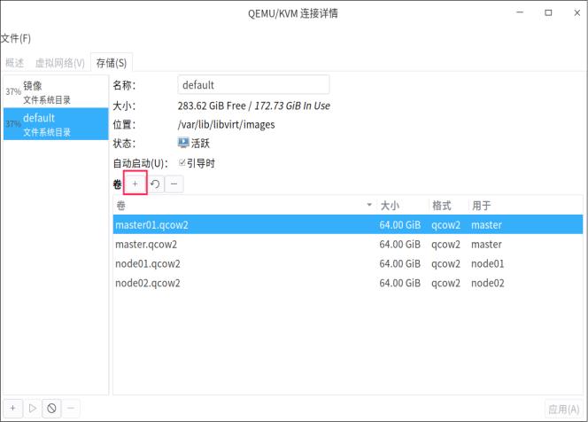 打开KVM管理工具后,在“编辑”菜单中选择“连接详情”,单击“存储”,如图2-11所示。