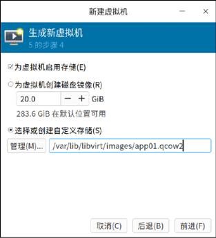 在图2-19所示的对话框中,勾选“为虚拟机启用存储”,输入硬盘镜像,单击“前进”,进入图2-20所示的对话框。