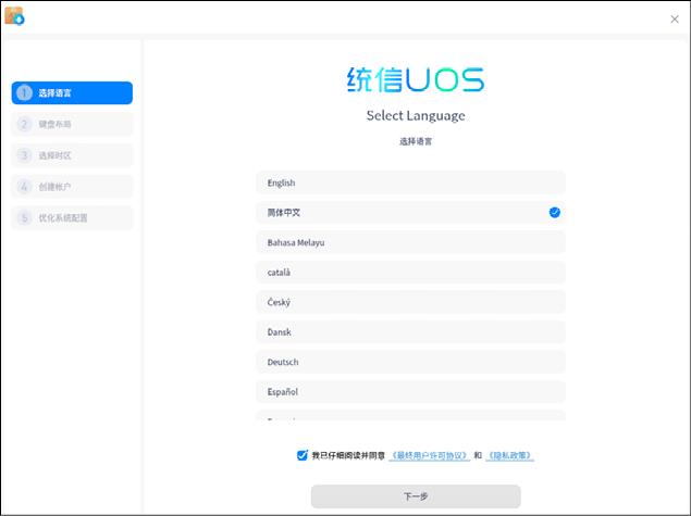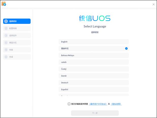 在图2-22所示界面中,选择语言,阅读并勾选“我已仔细阅读并同意《最终用户许可协议》和《隐私政策》”,然后单击“下一步”。