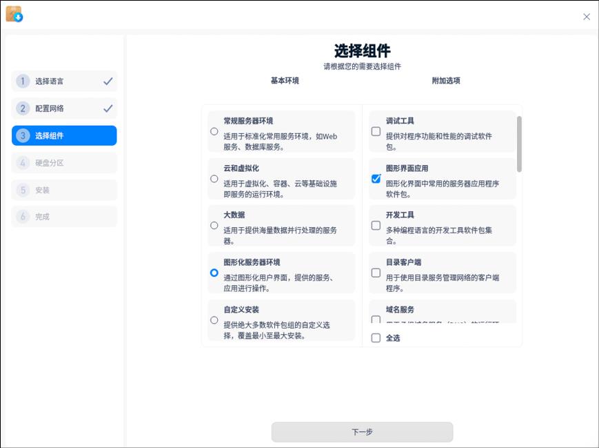 在图2-24所示界面中,选择安装“图形化服务器环境”和附加的“图形界面应用”。然后单击“下一步”。