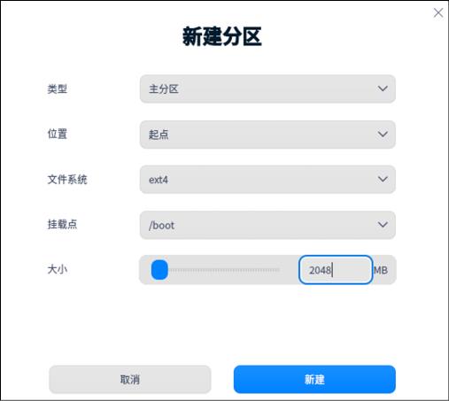 如选择“手动安装”会分很多区,存储空间会被拆分,可以仅创建需要的分区。先建立/boot 分区,如图2-27所示。