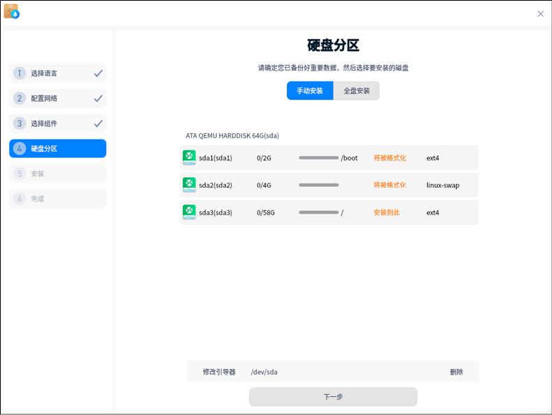 其中各分区大小如下:/boot分区约为2GB;交换分区约为4GB;/分区约为58GB。硬盘分区创建完成后继续安装系统,等待安装完成,如图2-31所示。