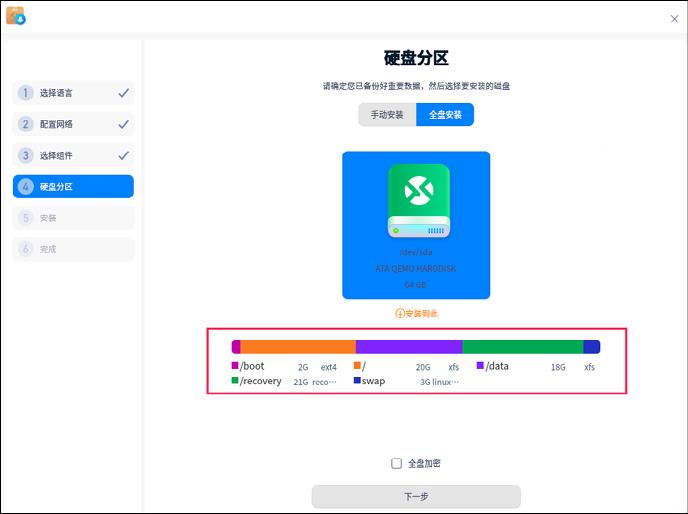 然后对硬盘分区,如图2-25所示,如果不需要重新分区,选择全盘安装即可。