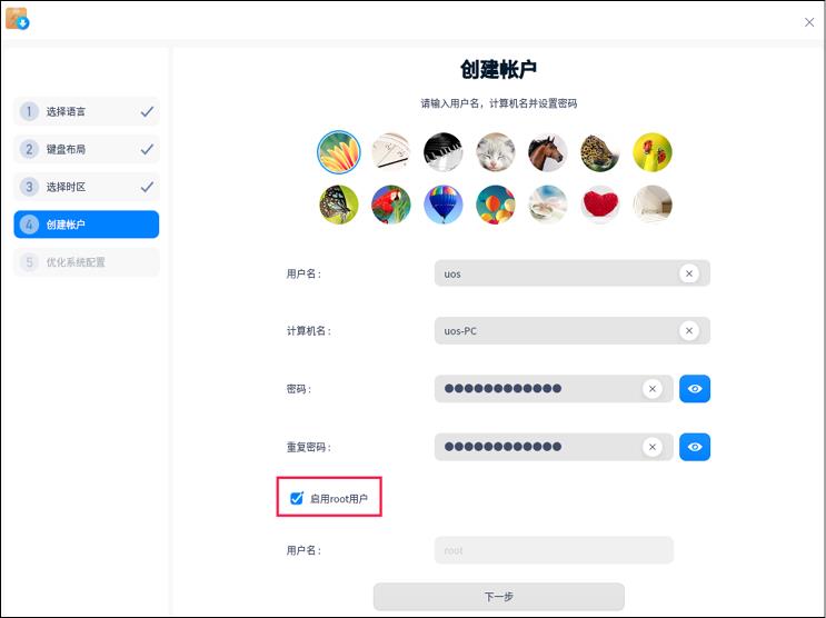 设置键盘布局并选择时区后,即可创建账户,并设置密码。注意密码不能少于8位,并且包含大小写字母、数字和特殊字符,如图2-33所示。