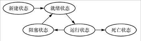 线程从创建、运行到结束包括下面5个状态:新建状态、就绪状态、运行状态、阻塞状态及死亡状态。线程状态之间的关系如图1-1所示。
