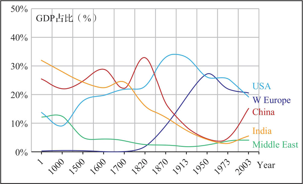 古代的四大发明都是硬科技技术,而2018年所谓的“新四大发明”,只有高铁是硬科技创新,其他三个都是模式创新。这说明什么问题呢?下面来看看在过去2000年里,世界上重要国家和地区的GDP在世界总GDP中的占比情况。我国的GDP占比最多的时候,也就是硬科技,或者说我们古代的四大发明诞生的时候。我国的GDP在2003年的占比大概是10%到20%之间,而且处在快速上升的趋势中,所以现在的“新四大发明”已经开始有硬科技的成分。随着中国经济的崛起,硬科技在所有的发明创造里的占比会越来越高,这说明我们现在处在硬科技爆发的前夜,随着我国经济的大爆发,一定会迎来硬科技的大爆发。