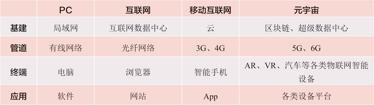 硬科技是从PC到互联网,再到移动互联网,之后到元宇宙这样一个方向的迭代。相关的基础设施建设,也是从局域网过渡到互联网中心,再到云,接下来我们在元宇宙里会看到各种各样基于区块链、超级数据中心的新基建设施。