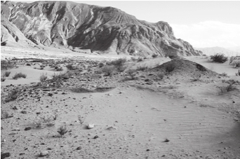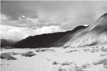 进入沟内,前面已经无路可走,越野车凭着良好的性能在沟壑纵横的沟谷中左冲右突,终于把我们一行人送到了距离当年发掘点不远的一处台地边缘。我们攀登上台地,昌果沟遗址的全景尽收眼底。这处遗址距离沟口约3公里,呈南北一线延伸,高出河沟表面约3米,一条小河傍着台地的西侧向南流去,遗址面积约6万平方米。遗址的东、西、北三面环山,山峰上除了生长有一些低矮的灌木丛,几乎看不见高大的林木,地表沙化严重,加之沟谷里风沙很大,整个遗址都被沙丘覆盖,原来发掘过的探方都被漫无边际的黄沙湮没。