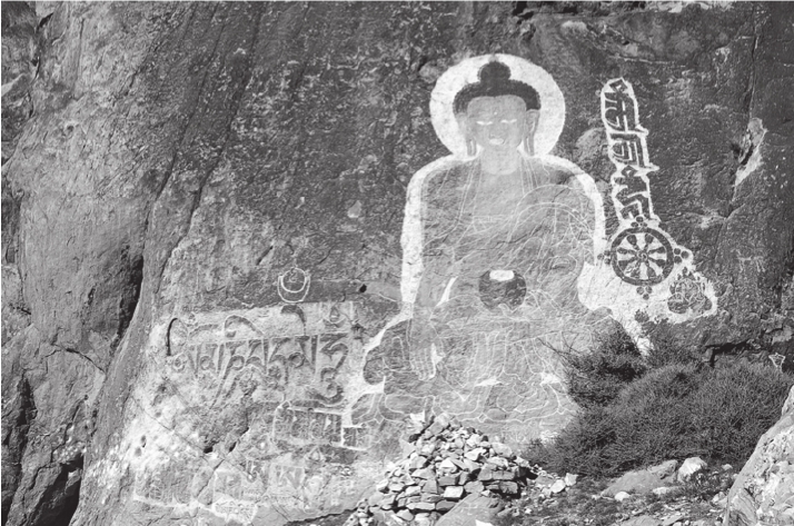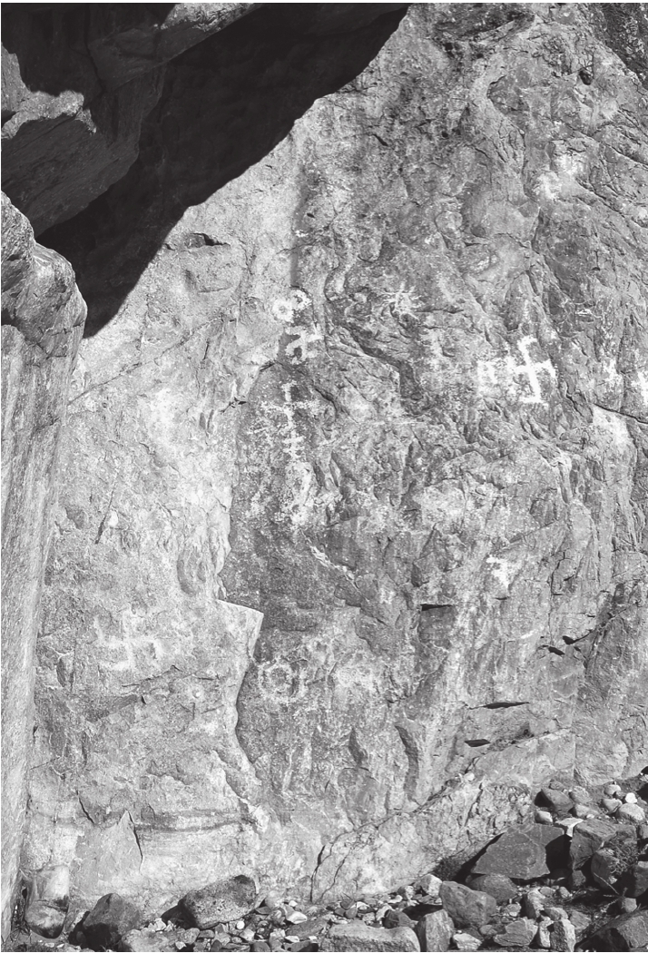 中午时分,我们驶入了一条三面环山、一面临水的三角形沟谷,这条南北狭长的谷地就是昌果沟,长13公里,宽约2公里,一条小河从北向南流出,汇入雅鲁藏布江。从地理环境上看,这的确是西藏史前时代居民一处较为理想的聚居之地。就在沟口处,更堆叫停了两辆越野车:“这里有摩崖造像,大家下车看看吧!”他推开车门带着我们径直朝着山谷开口处的岩壁走去。沟口两边的岩壁两相对峙,如同两扇大门一样把守着沟口,在岩石上面果然雕刻有高大的佛教造像,上面还残存有涂彩的痕迹。就在我们细心观看这些佛教遗迹的时候,我突然发现在佛像的下面似乎还叠压覆盖有一些隐约可见的刻画痕迹,于是我和对西藏岩画素有研究的李永宪一道攀上岩壁,细心地观察搜寻起来。在几乎呈垂直状的岩壁上,我们发现这些刻画出来的隐隐约约的线条竟是一些动物和人的形象!结果发现,岩面上除了雕刻有佛像,还有被这些后来雕刻的佛像所覆盖的年代更为久远的岩画。我们沿着岩壁一路观察,发现在十多米长的岩壁上,刻画有马、羊、狗等动物形象,还有骑在马上的武士和牧人,以及大量如同“雍仲”那样的符号,都采用阴线刻的技法刻出,十分古拙,年代应当远远早于后来覆盖在上面的佛像。这个意外的收获令我们十分兴奋,因为在过去公布的考古资料中,似乎没有过有关的信息,这或许是一个新的发现。这些迹象还暗示着一个事实:今天的昌果沟虽然已经被流沙湮没覆盖,但在远古时代却很有可能是人们居住、交往的一个重镇与要冲。