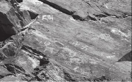 同这些动物和人物形象交织在一起的,还有大量的“雍仲”符号和其他一些含义不明的符号,这表明当时可能已经产生了原始的自然崇拜。这些“雍仲”符号通常被认为与西藏的本土宗教本教有关,是本教所崇奉的象征性符号,实际上也可以理解为对太阳、日光崇拜的象征物,这在欧亚草原地带的游牧民族中有大量类似的证据。