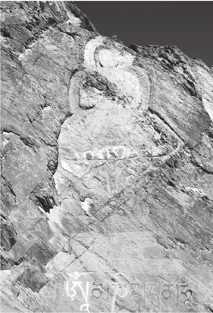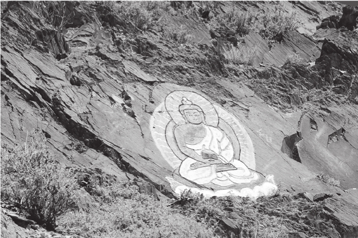 正当我们沉浸在发现的喜悦当中的时候,却猛然间发现一向健谈的更堆这时却沉默无语了。我走到他跟前,一切都明白了。原来,他注意到有好几处岩画已被后来刻凿的佛像破坏。认真地观察一番之后,我发现这其实也是一个非常值得注意的文化现象。这些后来才刻成的佛像其实也可以分为不同的时期,有的年代较为久远,不仅风化程度较高,而且佛像的题材风格也具有早期佛教造像的特点,如台座之下有蹲着的瑞兽,而有的佛像显然是现代作品,无论从凿造技法和题材表现上看都显得粗糙草率。令人遗憾的是,这些佛像都刻在了时代更为遥远的岩画上面,将这些古老的岩画或完全覆盖,或大部破坏。这种情形在考古学上有一个术语,叫作“叠压关系”或“打破关系”,对于确定共存于一处但时代先后不同的遗存的相对早晚年代关系有着极为重要的意义,具体到这处岩画点而言,我们便可以由此推测,岩画的年代一定早于这些佛像的开凿年代。