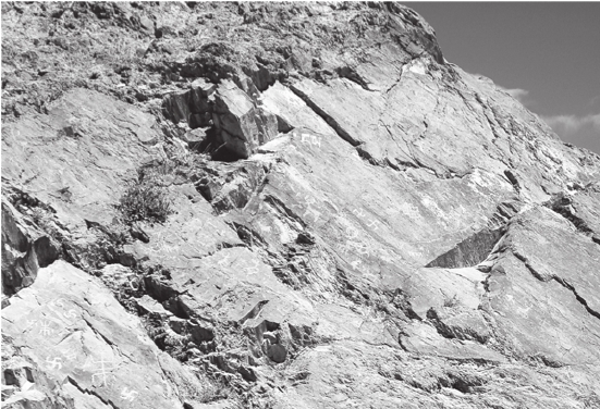 “昌果沟到了!”随着更堆的一声呼喊,我的思绪才被打断,回到了现实中的昌果沟。昌果沟沟口如同一个漏斗,前宏后窄,沟口两端的山体笔立挺拔,如同两扇门扉紧锁着沟口两翼。我们将车停在沟口,开始徒步向沟内移动。刚刚走出几十米远,忽然间我和李永宪几乎同时发现,在沟口崖壁上刻有若隐若现的图案,一旦有阳光照射在岩石上,这些图案就变得十分醒目。“岩画?!”这个念头如同电光石火般从我脑海中掠过,也忽然激活了我的记忆。我记得何强当年提到过,在昌果沟的调查中曾经发现过三处岩画地点,只是后来一直没有见到正式公布。我们眼前看到的,难道正是其中的一处岩画地点?