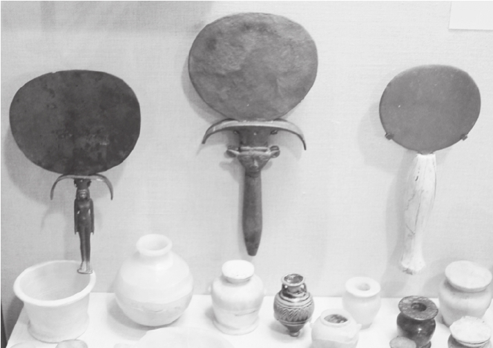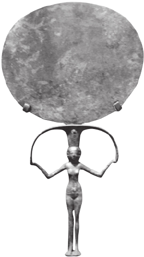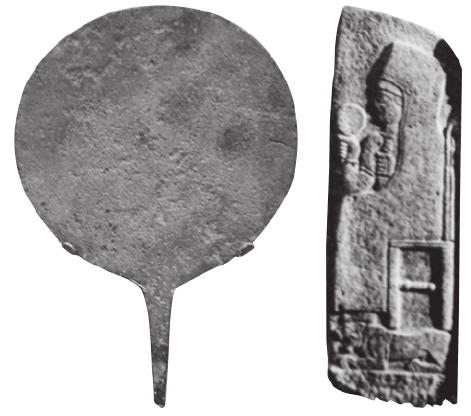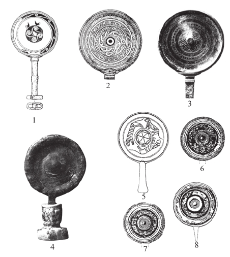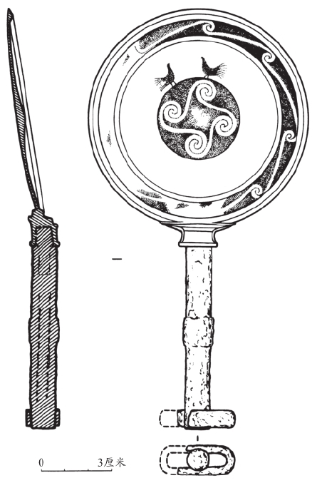 带柄镜在欧亚大陆有着悠久的发展历史和辽阔的流行地域。它的原型最早出现在西亚地区古代希腊和古代罗马文明之中,主要的特点是镜面采用青铜制作,而镜面下面的手柄却可以采用多种材质,然后合成为一体。带柄镜在中近东和中亚地区也出现得很早,据日本学者樋口隆康《古镜》一书介绍,早在公元前6000年的土耳其新石器时代遗址的地层中,已出土有黑曜石制作的带柄镜。其后,在红铜与铜石并用至早期铁器时代(约公元前3000—前2000年)的伊拉克、伊朗、巴基斯坦等地,也均出土有带柄青铜镜。进入铁器时代后,这种带柄青铜镜的发现也更为普遍,柄部的变化变得极为丰富,有圆条中空形、长条形、连环形、带銎方形等,同时,既有与镜面同体铸成者,亦有采用其他材料(如象牙、黄金等)分制镜柄,然后再与镜面连接合成者。曲贡M203所出的这枚带柄镜,也属于两种材质合铸而成的,只是柄部的材料采用铁制而已。