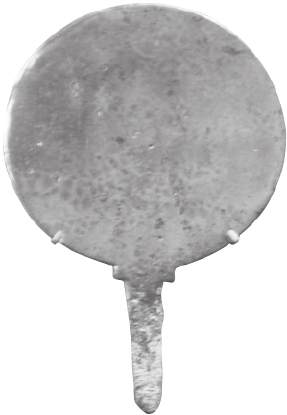这面带柄铜镜发现于曲贡遗址II区第203号墓(编号M203)的墓室北端中部,墓主人是一位22—24岁的青年男性,墓内仅有两件随葬品,一件为陶器,另一件就是这面带柄铜镜。这面铜镜镜面呈圆形的板状,表面较光洁,略呈银白色,镜子的正面为素面,无纹饰。镜背向内凹入,镜周有一道微凸的边缘,出土时附着有较多的氧化物。镜面直径9.3厘米,厚约0.3厘米,中心部位稍稍隆起,铜镜的边缘截面呈三角形。镜柄为铁质,出土时柄首与镜面结合处因锈蚀严重已断裂开来。铁柄长9.4厘米,直径1.4厘米,中空。从制作工艺上看,这面铜镜是分为两步铸造完成的,先期铸造铁柄,然后再将事先已经制作成型的铜镜与铁柄一道合铸,最后成型。还有一个值得注意的特点是,这面铜镜的镜面与手柄并不在一条水平线上,二者呈约10度的夹角。镜柄为空心圆柱状的铁柄,柄端还有一环,可供穿系之用。另外,在铜镜手柄的中部,还有一道凸起的箍。这些特征表明,铜镜使用时,既可以手持,也可以悬挂起来。