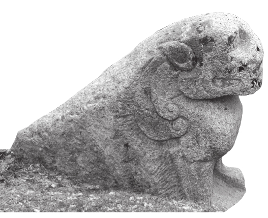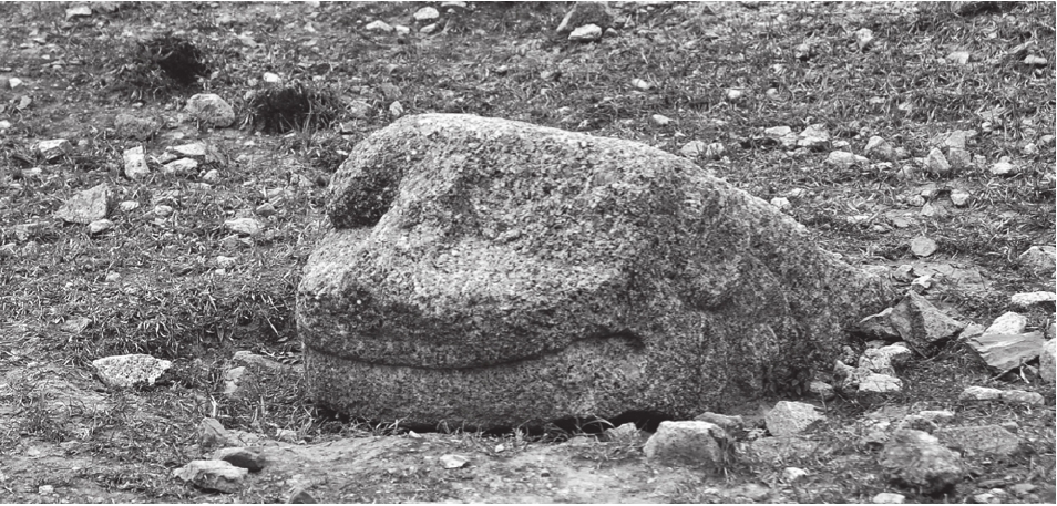 经过一番搜寻,我终于在一号墓前的两角上,找到了这对石狮。西侧角上的一只半蹲在地,方头大耳,龇牙咧嘴,鬃毛上卷,下半身还掩埋在土里;东侧角上的一只大半个身躯都被埋在土里,只露出头部和少许身躯。从造型上观察,两只石狮基本相同,都显得比较粗糙古朴,在艺术造型方面与藏王陵墓发现的那尊石狮相比较则要逊色许多。两尊石狮看来还不时有人前来朝拜,头上都绕着白色的哈达。后来,我查询了当年的考古调查报告,才知道原来这两尊石狮都没有雕出后腿和尾部,身躯的下方紧连着长方形的基座,且都用整块的巨石雕刻而成,在基座的两边用加工过的三角形石块加以固定。眼前看到的石狮子又被埋进了土里,看来是当年考古队员们在发掘测量之后采取的保护性措施,我不由得对我的同行们深表敬佩,正因如此,石狮的保存情况还十分完好,十多年来没有受到人为和自然的破坏,这是非常值得庆幸的事情。