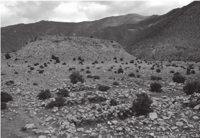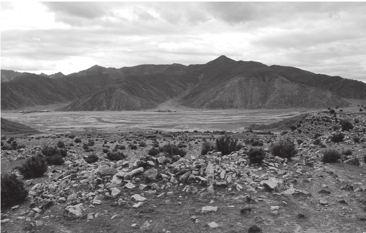 顺着墓丘后部低平处的土坡,可以登上墓葬的顶部,我逐一观察,发现几乎所有墓葬在顶部靠近后腰部的位置上都有一个巨大的陷坑,这是早年墓葬被盗掘后留下的遗迹。藏族史书记载,在吐蕃王朝末期,吐蕃全境爆发了平民和奴隶的暴动,几乎所有的藏王陵墓(松赞干布陵墓除外)都遭到盗掘,看来远在拉孜县境内的这处吐蕃贵族墓地也未能幸免。站在墓顶,还发现一个奇特的现象,许多墓葬在后腰部都有一个向外凸出的坡道,直接与山麓的坡道相接,使墓葬的平面总体上呈凸字形。联系到汉藏文献记载,我推测有两个可能性:一是这条坡道是为了修筑墓葬时施工便利而设置的工程设施,营建墓葬的工匠和奴隶可以由此将石料、砂土、木料等运输到墓葬进行施工;另一个或许与吐蕃时期的“墓祭”有关。《册府元龟·外臣部·土风第三》“吐蕃”条下记载:“(吐蕃)人死,杀牛马以殉,取牛马头周垒于墓上。”《旧唐书·吐蕃传》也记载说吐蕃赞普死后,要在墓上建大室,立土堆,树以杂木作为“祠祭之所”。藏文史书《德如教法史》记载松赞干布陵墓在四角上建有“四神殿”,作为祭祠的享堂。查木钦墓地这种凸字形的墓葬,或许就是为后人祭祠而设计的。