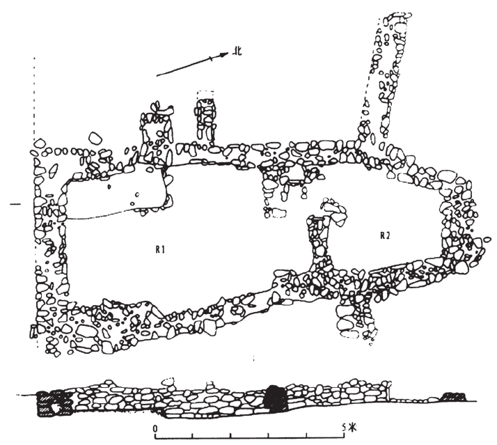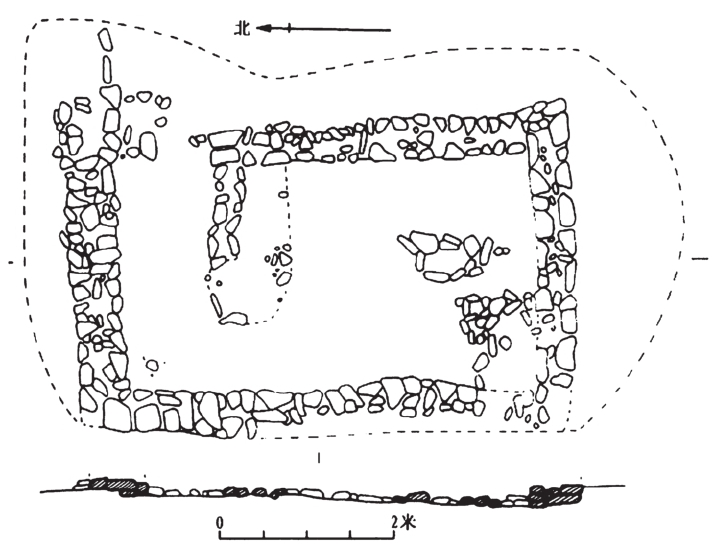 原来,这些房屋的建筑形式是采用半地穴式,先在地下挖出一个半人深左右的长方形或方形的地穴,然后沿着地穴的四壁用经过挑选的石块砌壁,地穴的上半部分用何种式样来加以封盖已无法考证。