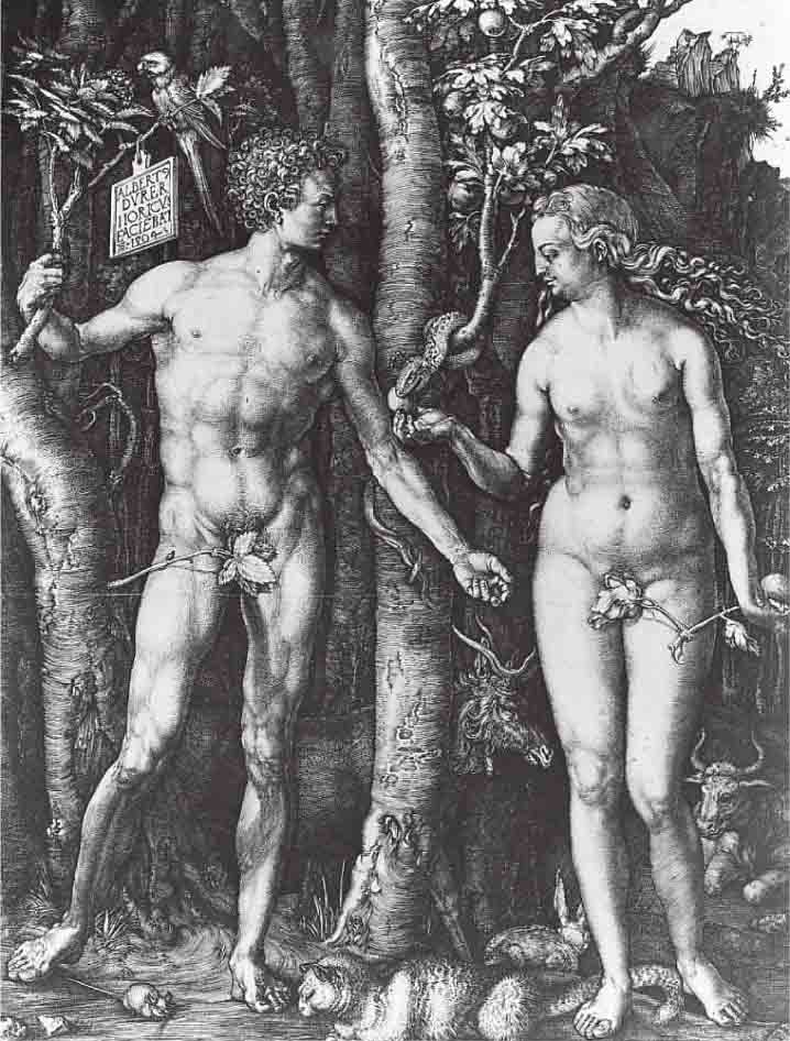 阿尔布雷希特·丢勒作于1504年的《亚当与夏娃》(Adam and Eve)体现出艺术家如何身处文艺复兴中诸多其他智识领域及手工行业的交汇处。他的版画首先是精湛画技的施展,用精细的线性细节刻画光线、量感和多种肌理。同时,在某种程度上,它也是一份有关适用于人体理想比例的宣言。