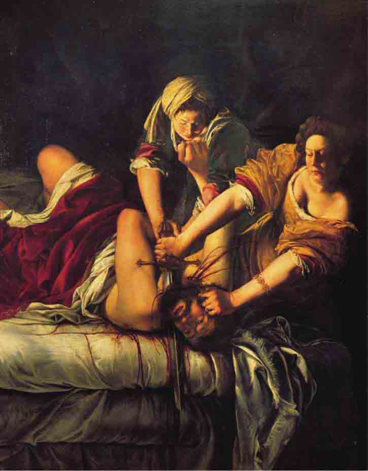 了解艺术家的个人经历可以让我们超越图像中的象征和叙事,对其作品拥有更丰富的理解。当阿尔泰米西娅·真蒂莱斯基(Artemesia Gentileschi)决定描绘犹滴(Judith)与荷罗孚尼(Holofernes)的主题时,这并非一个新颖的选择。此前此后,还有许多艺术家受到这个故事吸引,因为这是一个同时描绘美和暴力,也包含果敢的壮举和英勇的美德的机会。面对布甲尼撒(Abuchadnezzar)的大将荷罗孚尼,犹滴诱骗了他,灌醉了他,然后杀死了他,将自己的人民从荷罗孚尼的军队下解救出来。不过,艺术家一贯会对犹滴的容貌进行性化处理,但阿尔泰米西娅对此十分不屑——文本中表达得很清楚,犹滴没有付出贞操的代价——她转而展现这位主角的力量,包括她强健的体格和坚定的信念。阿尔泰米西娅意识到,如果这幅场景真实可信,那犹滴应该会需要侍女阿布拉(Abra)相助,阿布拉不能袖手旁观,而是要在这位强壮的将军剧烈抽搐时奋力遏制他。即便故事就此结束,这幅画作也会是一项伟大的成就,但故事并未告终。仅仅数年前,十几岁的阿尔泰米西娅本人曾遭受不幸,父亲的同事强奸了她。她选择这个主题,是用图画的形式反击以复仇,抑或是为了治愈自己的心理创伤,她的朋友和赞助人是否领会到其中尖刻的讽刺意味,我们永远无法确定她的具体动机为何。但我们可以肯定地说,她坚持了下来,并且比同时代的任何女性画家都更为成功。可以说,阿尔泰米西娅为著名女英雄的主题开辟了一个小众市场。描绘犹滴与荷罗孚尼这样的故事时,阿尔泰米西娅的创作手法有别于同时代的男性艺术家的各种版本,这肯定受到了她的性别及个人境遇的影响。
