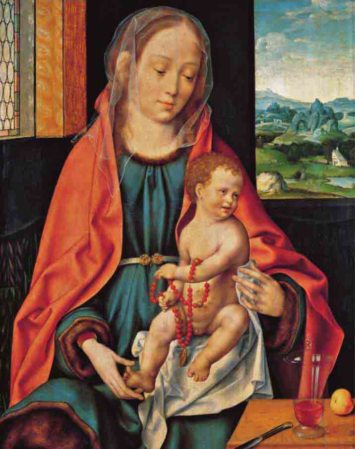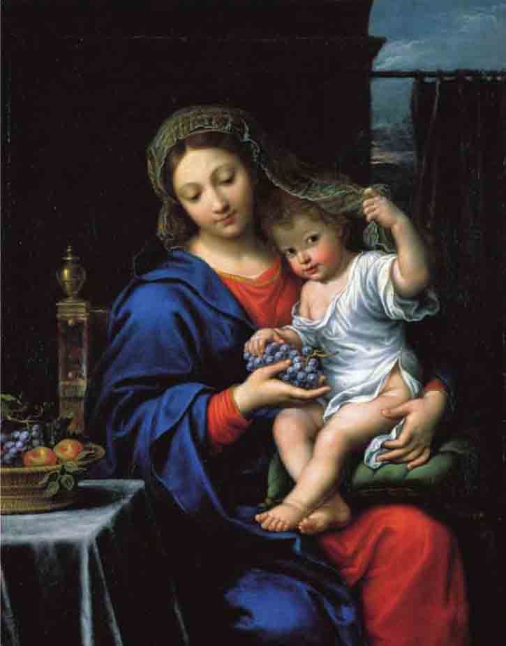 皮埃尔·米尼亚尔(Pierre Mignard)的《持葡萄的圣母》(Virgin of the Grapes)中的葡萄则截然不同。这些葡萄不仅仅是马利亚给自己学步孩子的可口零食,更象征未来的基督受难。圣餐变体(面包与葡萄酒圣变为基督的体与血)是天主教弥撒的核心内容,因此,17世纪的观者可以轻易辨识葡萄的含义。这个象征直白易懂,然而米尼亚尔让圣子用温柔的手势玩弄着母亲的头巾,还特意用一幅窗帘半遮住他们身后的风景,好像在暗示还有什么事物尚待揭晓。这一概念也被扬·达维茨·德·黑姆以一种优美但颇直截了当的方式运用在《水果花环中的圣餐》(Eucharist in Fruit Wreath,另见第247页)中,还被雨果·凡·德尔·格斯运用在《波尔蒂纳里祭坛画》(The Portinari Altarpiece,另见第60~61页)中;我们可以在《波尔蒂纳里祭坛画》里看到,它采用了诸多更为复杂的植物象征手法。米尼亚尔意欲呈现的显然并非一个谜题,而是人类之间亲切愉快的互动。