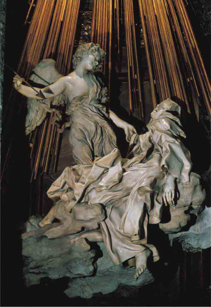 在17世纪,也就是我们常说的巴洛克时期,天主教徒凭借自己的正统信仰,向新教的宗教改革发起挑战。他们重视图像的价值,将其作为复兴圣人崇拜的一种手段。吉安·洛伦佐·贝尔尼尼(Gian Lorenzo Bernini)的祭坛雕塑《阿维拉的圣德肋撒神魂超拔》(Ecstasy of St. Theresa of Avila),是他在17世纪40年代为罗马的科尔纳罗(Cornaro)家族设计的一座富于动感的礼拜堂的一部分。如同戏剧表演达到高潮,阿维拉的德肋撒被一位天国的天使用圣箭射中,陷入神魂超拔的体验。这位天使并非丘比特,但德肋撒用一个性隐喻表达了自己的观点,即对上帝的渴望远超任何肉体快感。这种感受,贝尔尼尼不仅刻画在德肋撒的面部表情之中,也刻画在她身边翻卷起伏的宽大衣褶当中。石头看上去有如比之更轻的材料,它是光滑的肌肤,是长羽的双翼,甚至是云。它如同摆脱了重力的吸引,这是因为贝尔尼尼采取了一种在当时没有任何其他艺术家胆敢尝试的方式去雕琢大理石。整体作品,配合自然光从一扇隐蔽的窗户倾泻而下,洒下瀑布般的青铜光束——旨在激发公众对上帝之爱产生相似的热情。