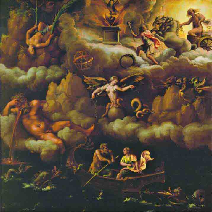 这类哀悼和夙愿往往会用托寓的形式表达出来。画中所强调的火,以及土、风、水,都是炼金术中不可或缺的基本元素。又名赫尔墨斯·特里斯墨吉斯忒斯的墨丘利据传是火的发明者,其名言“如其在上,如其在下”奠定了占星术的基本准则。欧洲学者认为,一个人对这些神祇及其天国的了解越多,就越能掌握有关俗世生活的奥秘——尤其是在基督教的理解方式之下。就绘画而言,无论其主题的学问有多么精深,都不能左右观者的阐释,因为绘画是描述性而非指导性的。聪颖的观者或许能辨识出艺术家的显著意图,但依然可以自行在更多层面上展开联想和解读。具有启发性的绘画鼓励人们用这种方式给画作增添更多意义。一些图画被故意画得扑朔迷离;而对另一些图画而言,“扑朔迷离”只不过是因为解密图像所需的种种关联现在已不为人知。