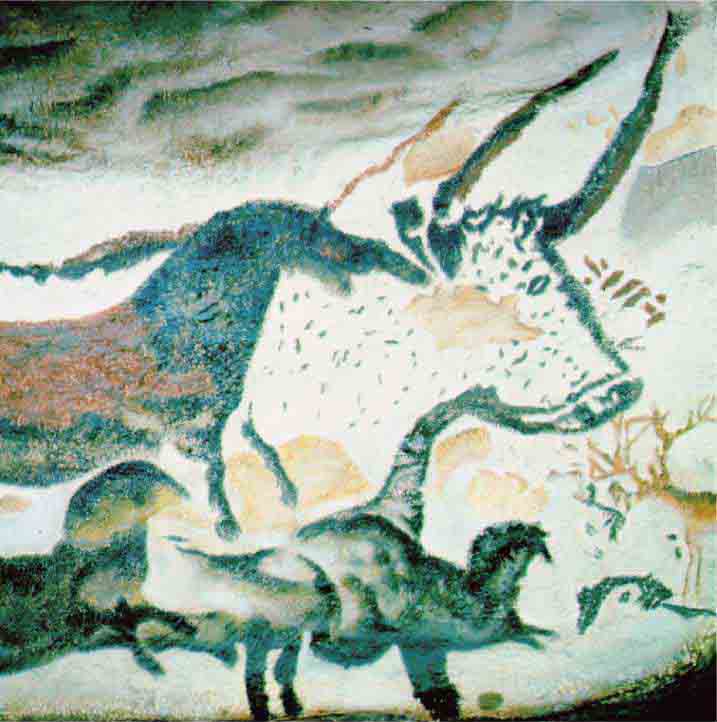 在拉斯科洞(Lascaux)这样的地方,人类凭借手艺和才智改造自然空间,其惊艳程度毫不亚于米开朗琪罗(Michelangelo)的西斯廷教堂(Sistine Chapel)。例如,在拉斯科洞内人称“公牛大厅”(Hall of the Bulls)的窟中,洞壁和洞顶上布满绘画,形成一幅再现历史情景的宏伟透视图画。一些图形高过1.8米,主体部分延伸得更宽,而且所画位置高于伸手可及之处,比如此处细节图中的野牛脑袋及一些别的动物。拉斯科洞内共有600余幅绘画,另有约1500幅画刻在岩石上。这些洞窟是人们在1940年意外发现的,其中有绘画的洞窟远离生活区,表明这些图像被用于仪式和特殊典礼,而非作装饰之用。为了绘制这些图像,艺术家要点上盛有动物脂肪的石灯,借着摇曳的灯光作画。这种石灯比油灯烧得更久,但光比蜡烛更暗。人们在洞窟里发现了许多这样的灯。这些绘画几乎没有叙事感,只有一幅又一幅积聚的图像,有黑有红,有大有小,有单个的也有成群的。值得一提的是,和认为这些动物在仪式中作呈现狩猎情景之用的早期观点相反,人们后来发现,它们与穴居者的实际饮食关系不大,艺术家是在用一种强烈的自然主义风格来展示这些动物。这样一来,尽管这些图像可能曾被用于巫术仪式和社交启动仪式,但它们并非如我们最初设想的那样是利己的生存祈愿。