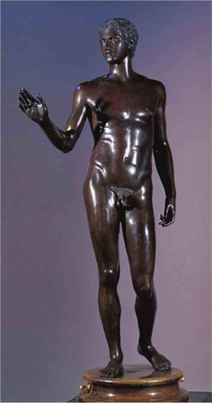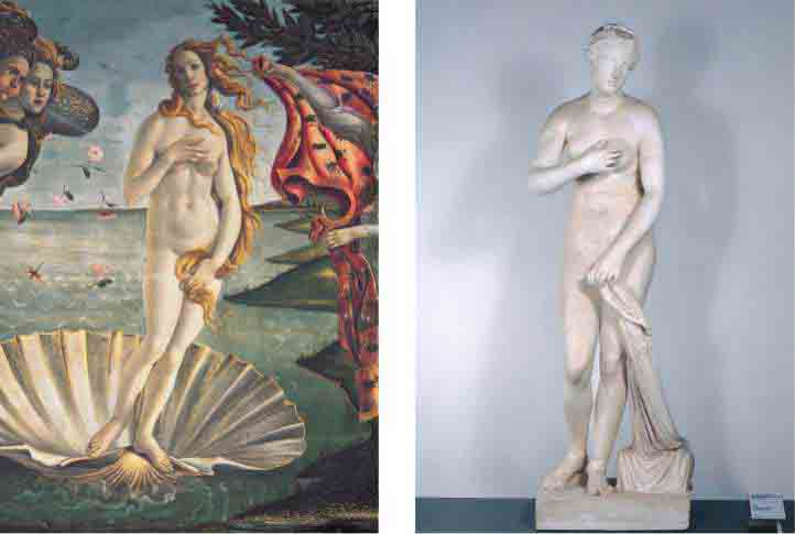 自约700年前起,文艺复兴艺术家开始有意识地回顾这些古文化以及一些特定艺术范式,以期重铸往昔的些许辉煌,并在自己的时代更上一层楼。他们从中借鉴理想准则、创作母题和人物姿势,结合自己在很大程度上以基督教为中心的鉴赏力,开创出一个旷世杰作层出不穷的新纪元。多西的《宙斯、赫尔墨斯与美德》和波提切利(Botticelli)的《维纳斯的诞生》(The Birth of Venus,另见第88页)等画作就是这一趋势的典范。“端庄的维纳斯”(Venus pudica)这种古罗马雕塑类型,是古希腊雕塑家普拉克西特勒斯(Praxiteles)在克尼多斯岛的阿佛洛狄忒像(Aphrodite of Knidos)中开创的,尔后传播开来,声名远扬。维纳斯掩住身体最撩人心扉的部位,动作轻柔,似露非露,从而让人注意到其肉体的魅力。波提切利从这尊古代雕像中借鉴了站姿及双手的位置,而且十分清楚其吸引力所在。不过,他并不满足于单纯的复制。他对现有的权威典范加以扩充,同时借鉴了前文提到的著名希腊画家阿佩莱斯的一幅遗失的画作,描绘了维纳斯从海中浮出拧干头发的样子。据传,阿佩莱斯的作品具有无人能及的优雅气质,但波提切利用充满美感的方式绘制维纳斯飘逸的长发及轮廓突出的四肢和臀部,从而改进了“端庄的维纳斯”这一范式。他更在画中添入风神、季节之神等其他神祇,让微风拂过,俏皮地嘲弄维纳斯的裸露。最终的作品堪称史上最赏心悦目的画作之一。