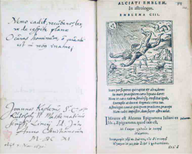 《伊卡洛斯之坠》(Fall of Icarus),收录于安德烈·阿尔恰蒂(AndreaAlciati)的《徽志集》(Emblemata Liber,莱顿,1573年),约翰内斯·开普勒(Johannes Kepler)签名