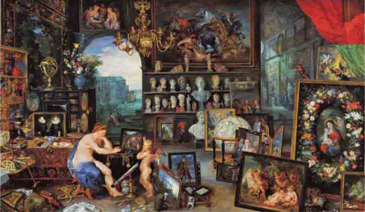 老扬·勃鲁盖尔(Jan Breughel the Elder)和彼得·保罗·鲁本斯(Peter Paul Rubens)的《视觉的寓意画》(The Allegory of Sight,见第214~215页)描绘的并非一批实际收藏,而是一个理想的“艺术厅”(kunstkamer),这是现代博物馆的前身。这类收藏中无疑混杂着古代雕像、现代绘画、珠宝和各种奇珍异宝。在文艺复兴初期,艺术中的创新是由赞助修建教堂和市镇广场的家族推动的。这种公共艺术不仅推动了艺术家之间的竞争,也推动了想在气度上胜过左邻右舍的赞助人之间的竞争。与此同时,贵族和新富的商人积累的私人财富也带来了新的家庭消费类别,艺术家开始迎合收藏家和自诩品位高雅、精通艺术语言的鉴赏家的个人喜好。到18世纪,在盛大的沙龙展中,公众艺术消费又形成一股新风尚。这些现象的产物便是19世纪和20世纪的公众博物馆收藏。