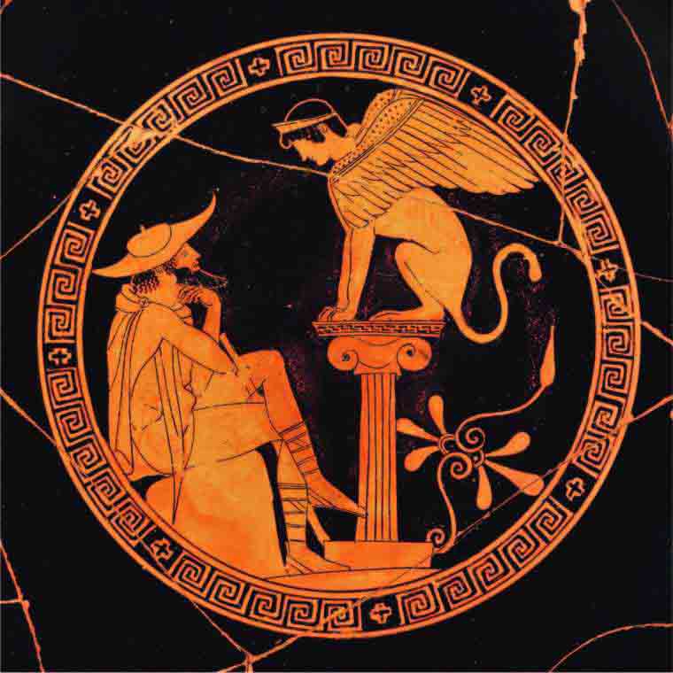 俄狄浦斯想出了斯芬克斯的问题的答案,即一个人在清晨是个用四条腿爬行的婴儿,在下午是个用两条腿行走的青年,在傍晚是个拄着拐杖用三条腿走路的老人。凭借自己的聪慧机敏,他与丧夫的底比斯女王成了亲,但这最初的鸿运却命中注定将以悲剧收场。底比斯灾疫连发之时,他发誓要找到杀害前任国王的凶手,殊不知犯下这桩罪行的人正是自己,也不知道自己无意中娶了母亲为妻,只因他小时候遭到遗弃,所以与母亲并不相识。在这只制于公元前5世纪的酒具——基里克斯杯