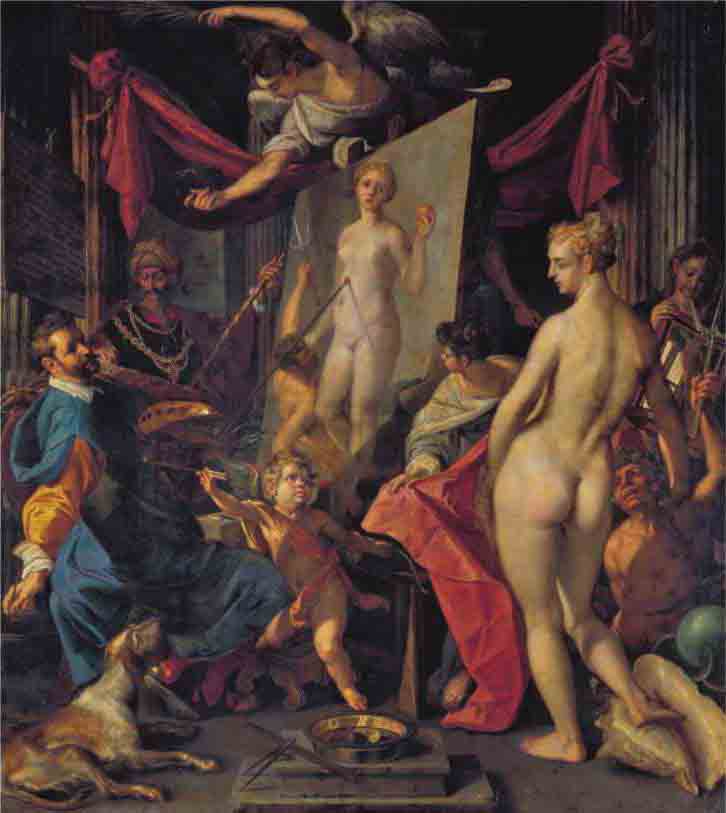 所说的古代格言“Sine Cerere et Libero friget Venus”,意为“没有刻瑞斯(Ceres,粮食女神)和利柏耳〔 Liber,酒神,等同于狄俄尼索斯(Dionysius)或巴克斯(Bacchus)〕,维纳斯会冷”。16世纪,这句话在伊拉斯谟(Erasmus)的《箴言集》(Adagia)的不同版本中都得到解释:刻瑞斯和巴克斯提供的食物与酒滋养了维纳斯所代表的欲望。葡萄代表葡萄酒,而酒反过来“释放”了人性更低级的本能。尽管世上的年轻恋人都能大致理解画作要旨,但是在文艺复兴和巴洛克时期,如果能辨识出画作的文本传统及古代拟人化形象的大背景,就能说明观画之人才智非凡。一位经验丰富、博学多识的艺术爱好者会注意到,霍尔齐厄斯让丘比特(Cupid)在背后持弓,一面转向观者,好像在征询自己是否应该用火炬温暖维纳斯的心,让画中的巧喻更上层楼。