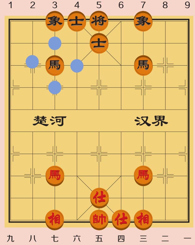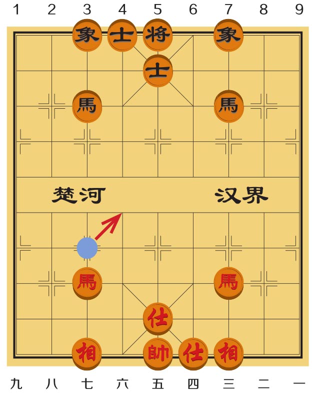 图6-4中红方有一匹马,假如其他棋子都待在原地不动,只走动红马,你有办法帮助这匹红马安全地跳到黑方的阵营中去吗?