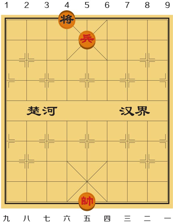 如图3-3,如果轮到红方走棋,红方控制“老将”的小兵千万不要动,只需要用帅走一步“等着”,黑方就被“困毙”了。当然,这里可千万不能犯错误,因为黑将的“千里眼”可是睁着的。