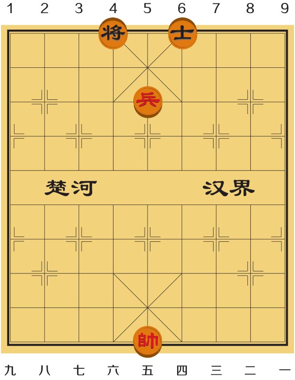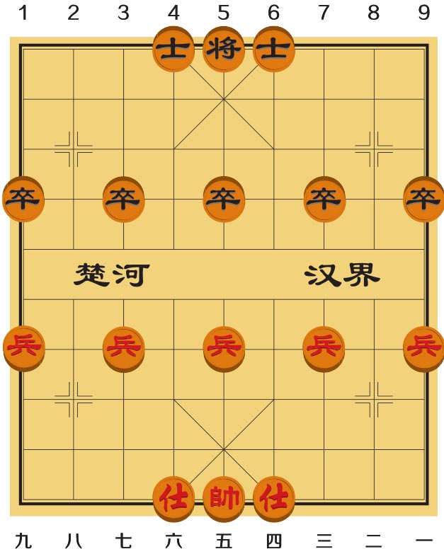 其实,在九宫中本来有两个仕(士)。我们来看一下红黑双方各有5个兵卒和两个仕(士)的初始状态的象棋盘。