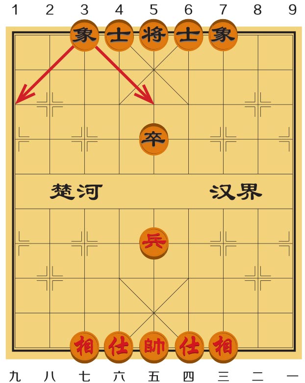 老将发现红方的三路兵还有一步就要过河了。象说:“不要担心,三路线和七路线上的兵都叫象头兵,只要我从底线飞到宫顶线,它就过不来了。”