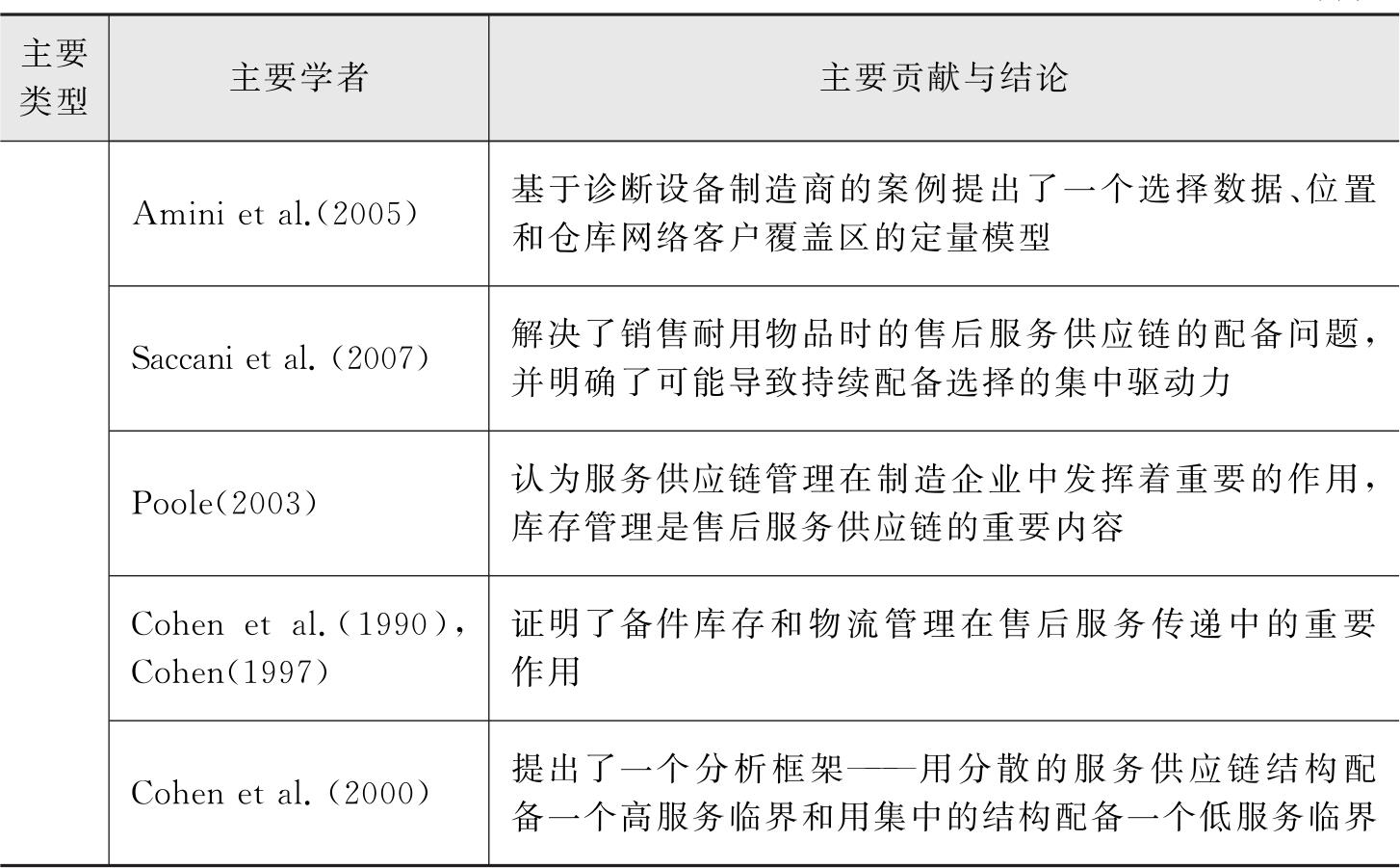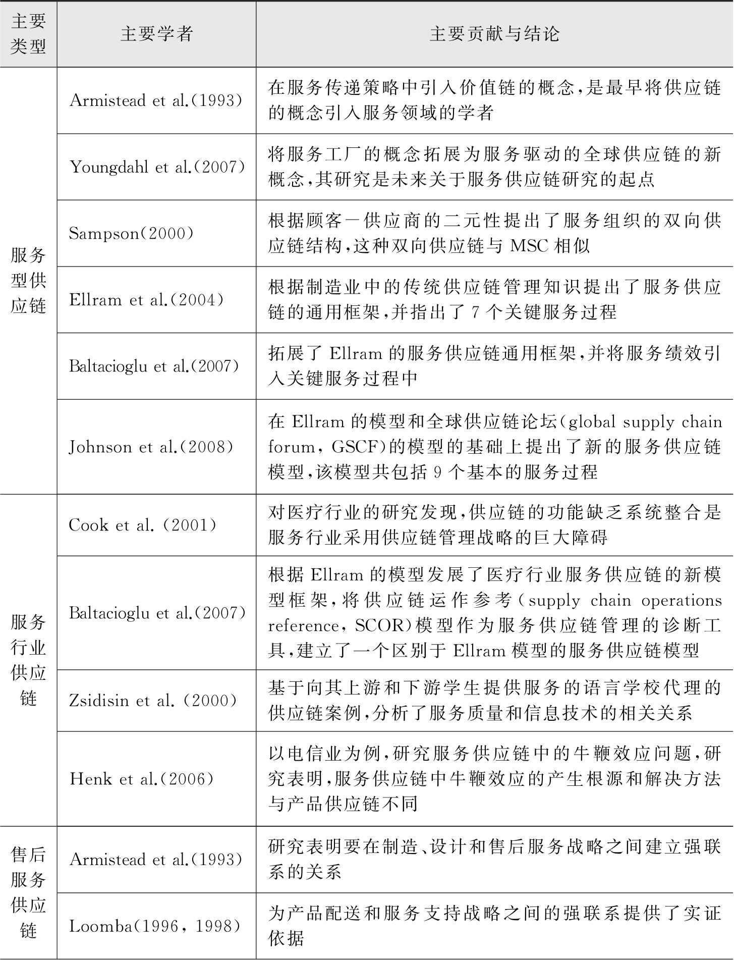 归纳国内外关于服务供应链的相关文献,可以总结出服务供应链的主要类型、代表学者及其主要贡献,如表1-1所示。