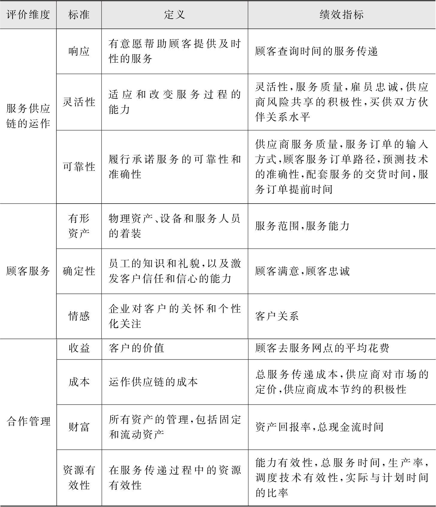 服务供应链是服务集成商和服务分包商之间的战略伙伴关系,服务供应链的绩效度量与服务供应链的战略伙伴是分不开的,服务供应链中合作伙伴关系的评估指标如表1-4所示,对服务供应链绩效的度量主要集中在战略、战术和执行三个方面。Dong et al.(2012)构建了服务供应链绩效评价的度量维度,主要包括服务供应链的运作、顾客服务和合作管理,具体度量标准、定义和绩效指标如表1-5所示。在分析服务供应链绩效水平和影响因素时,上述研究主要是对影响服务供应链绩效的因素进行维度划分,它将服务供应链绩效的维度划分为战略、战术和执行三个维度,通过详细指标的筛选,开发出适合的测度量表,并发放问卷进行调研,根据相关统计数据,利用结构方程模型对服务供应链绩效的影响路径进行分析。