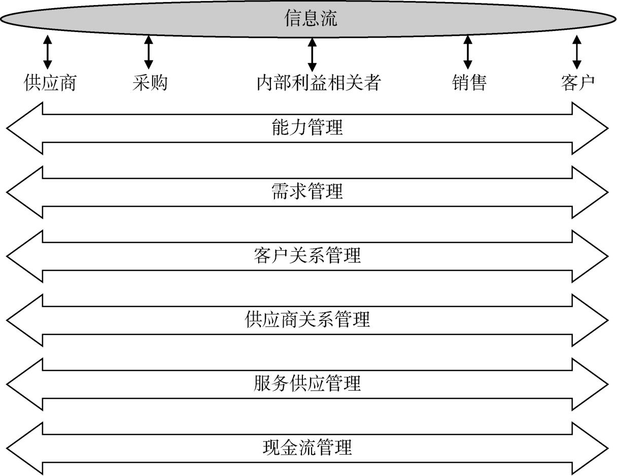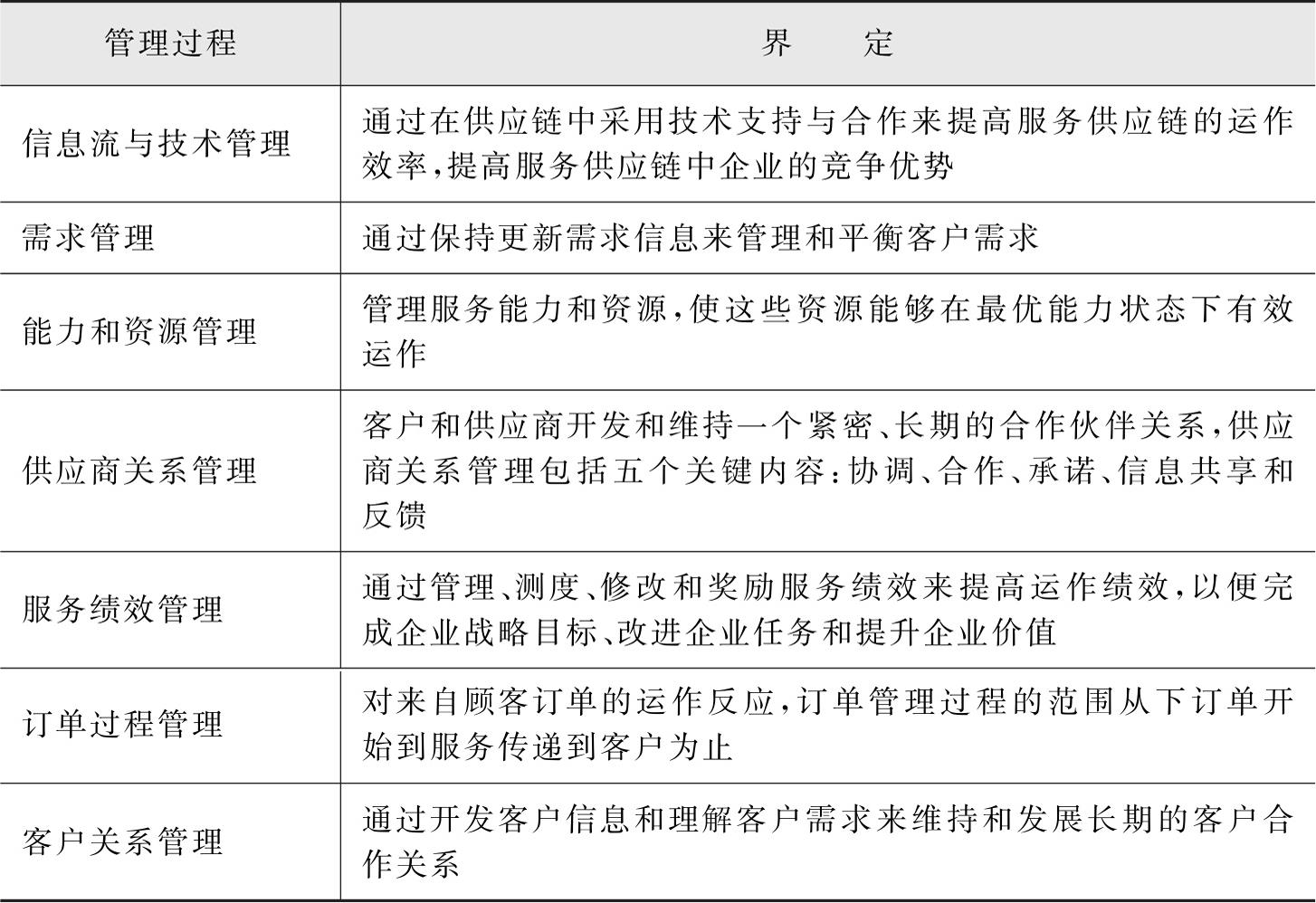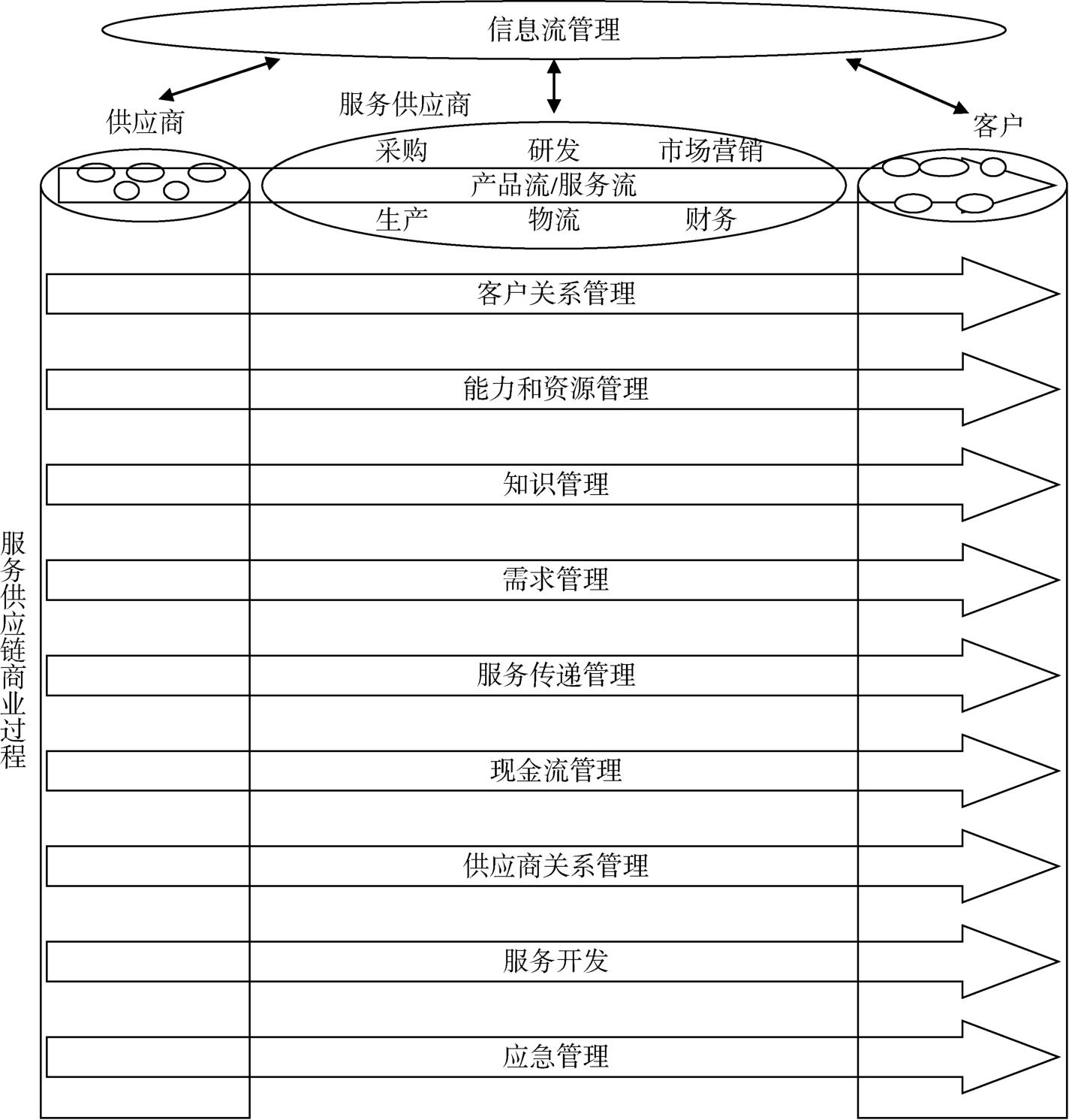 国外对服务供应链管理模型进行了较多研究。一种特定供应链的形成,往往由三方面决定:供应链的网络结构、供应链的业务流程以及供应链的管理要素,这三部分构成了供应链模型的理论分析框架。宋华(2012)认为服务供应链的框架体系和模式必然反映这三个方面。Lin et al.(2009)提出了服务供应链管理的概念框架,主要包括三个要素:网络配置、管理过程及管理组件,指出它们之间是相互影响的关系,并构建了服务供应链管理模型(见图1-2)。该模型主要包括十个基本的服务流程,分别为信息流管理、客户关系管理、能力和资源管理、知识管理、需求管理、服务传递管理、现金流管理、供应商关系管理、服务开发以及应急管理。本章将Lin et al.(2009)的模型与Johnson et al.(2008)(见图1-3)、Baltacioglu et al.(2007)(见图1-4)、Ellram et al.(2004)(见图1-5)以及Lambert et al.(1998)和Croxton et al.(2001)(GSCF模型,即全球供应链论坛确定的供应链模型,见图1-6)的模型做了比较,结果如表1-2所示。Baltacioglu et al.(2007)对服务供应链的各个过程的内涵做出了界定,如表1-3所示。Giannakis(2011)构建了服务供应链的参考模型(见图1-7),并分析了该模型在轨道交通中的应用。