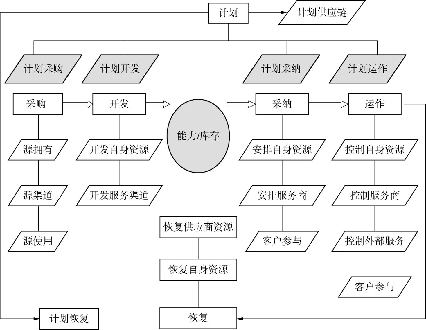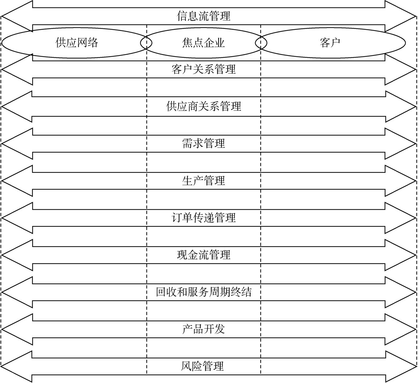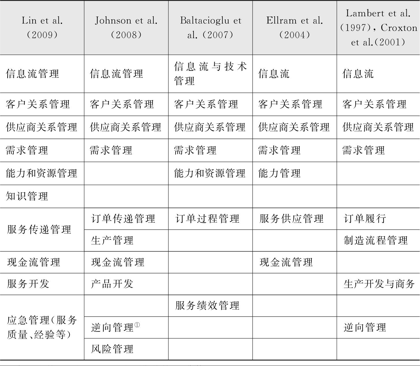 国外对服务供应链管理模型进行了较多研究。一种特定供应链的形成,往往由三方面决定:供应链的网络结构、供应链的业务流程以及供应链的管理要素,这三部分构成了供应链模型的理论分析框架。宋华(2012)认为服务供应链的框架体系和模式必然反映这三个方面。Lin et al.(2009)提出了服务供应链管理的概念框架,主要包括三个要素:网络配置、管理过程及管理组件,指出它们之间是相互影响的关系,并构建了服务供应链管理模型(见图1-2)。该模型主要包括十个基本的服务流程,分别为信息流管理、客户关系管理、能力和资源管理、知识管理、需求管理、服务传递管理、现金流管理、供应商关系管理、服务开发以及应急管理。本章将Lin et al.(2009)的模型与Johnson et al.(2008)(见图1-3)、Baltacioglu et al.(2007)(见图1-4)、Ellram et al.(2004)(见图1-5)以及Lambert et al.(1998)和Croxton et al.(2001)(GSCF模型,即全球供应链论坛确定的供应链模型,见图1-6)的模型做了比较,结果如表1-2所示。Baltacioglu et al.(2007)对服务供应链的各个过程的内涵做出了界定,如表1-3所示。Giannakis(2011)构建了服务供应链的参考模型(见图1-7),并分析了该模型在轨道交通中的应用。