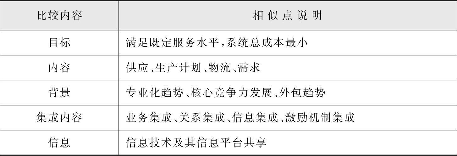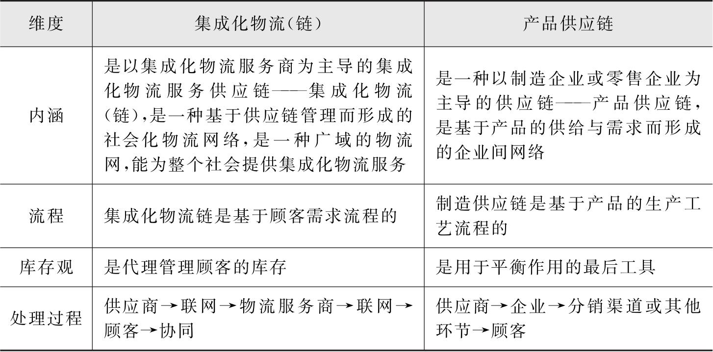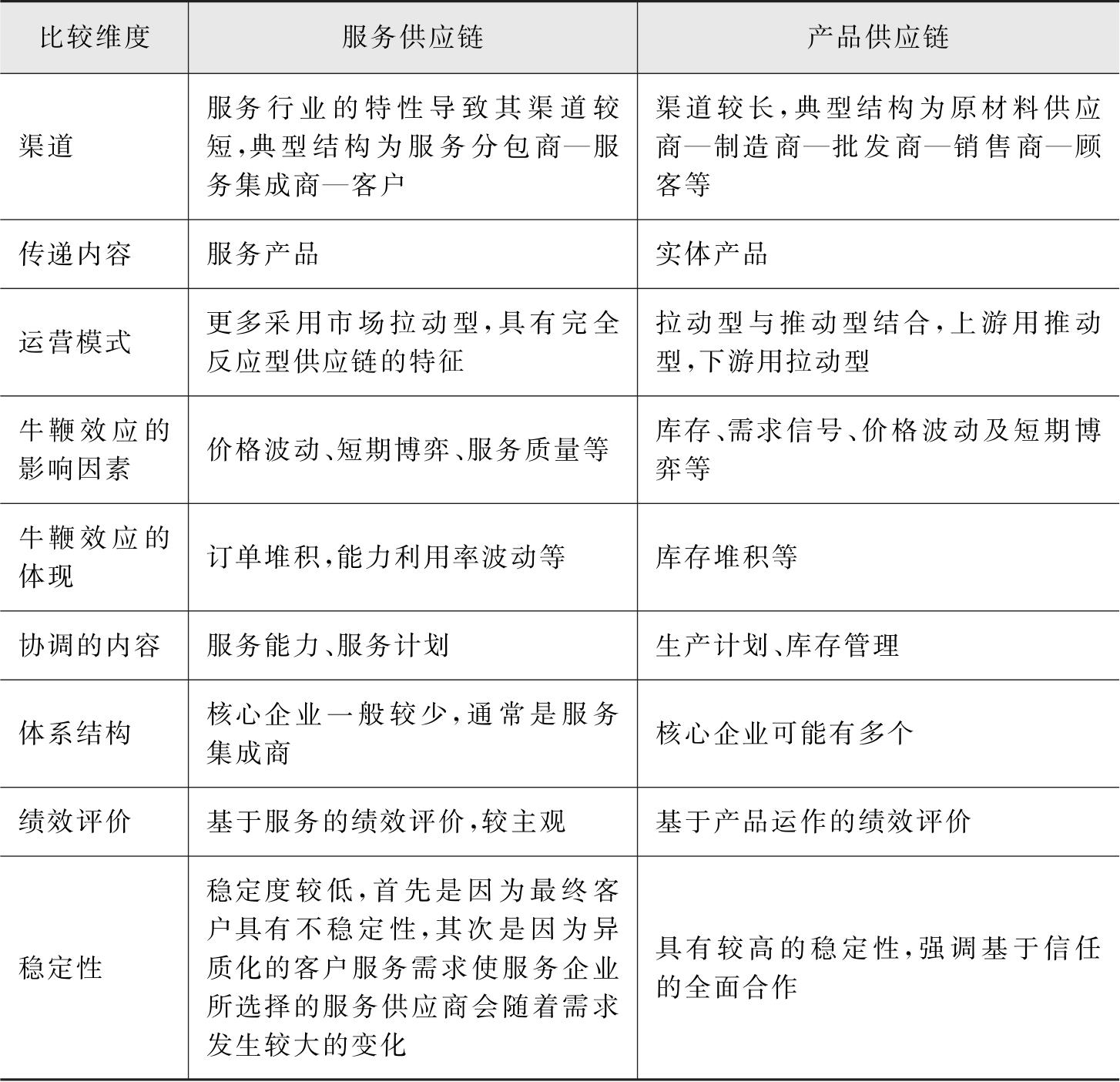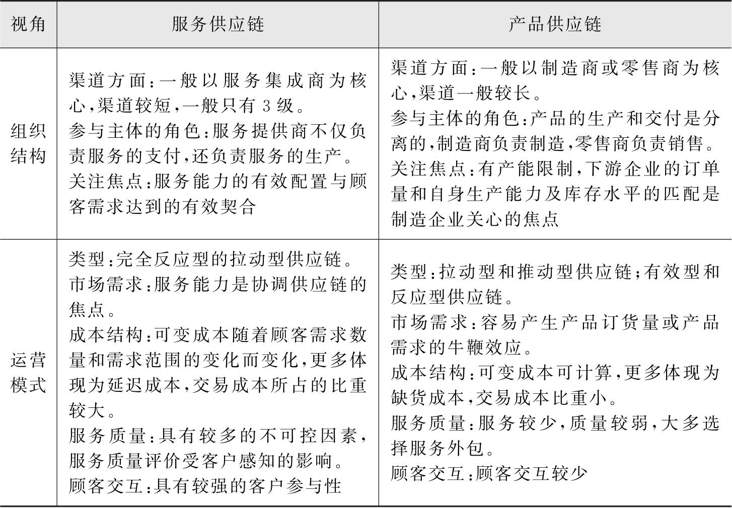 刘伟华(2007)通过对服务供应链和产品供应链的比较,归纳出两者的异同点,如表1-6和表1-7所示。宋华(2012)根据伟创力公司的管理实践得出服务供应链与产品制造供应链的差异,如表1-8所示。郭彦丽等(2012)基于服务区别于产品的特性,从组织结构和运营模式两个不同的角度对服务供应链和产品供应链进行了对比分析,如表1-9所示。郭彦丽等(2012)分别从产品流、资金流和信息流三个不同的角度总结了SaaS服务供应链区别于其他服务供应链的特征,如表1-10所示。舒辉(2004)基于内涵、流程、库存观和处理过程四个维度探讨了集成化物流(链)与马士华提出的产品供应链之间的主要区别,如表1-11所示。上述学者都对服务供应链与产品供应链的区别与联系进行了较为系统的研究,他们的主要区别在于研究的视角不同。