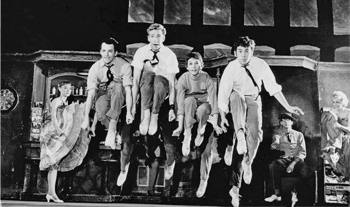 对于百老汇的黄金年代,如果要单独挑出一部剧来代表当时剧目的艺术高度,我个人会选择《西区故事》。它由音乐大师莱昂纳德·伯恩斯坦(Leonard Bernstein)创作歌曲,日后的音乐剧全能大神史蒂芬·桑德海姆创作歌词,著名编舞和导演杰罗姆·罗宾斯(Jerome Robbins)担任编舞。它将罗密欧与朱丽叶的故事搬到了美国,以移民帮派之间的冲突作为背景,讲述了一对身处不同帮派的移民情侣的爱情悲剧。