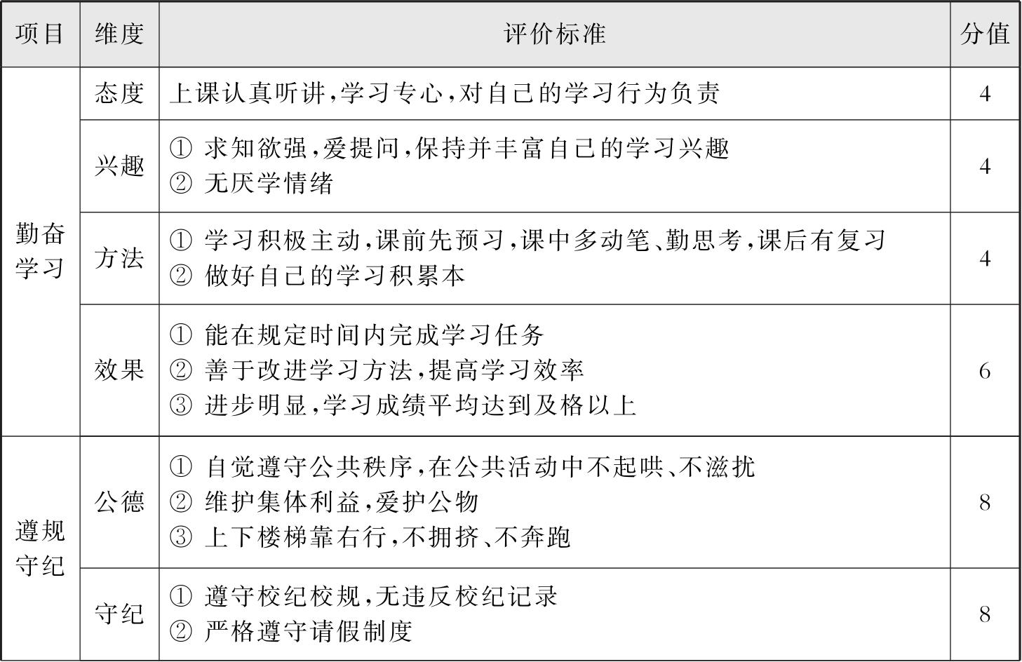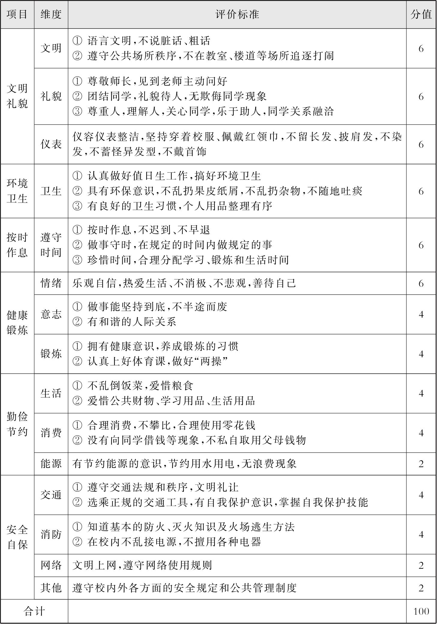 (6)健康锻炼。具体包括:①乐观自信,热爱生活、不消极、不悲观,善待自己。②做事要坚持到底,不半途而废。③与同学真诚相待,拥有和谐的人际关系。④拥有健康意识,养成锻炼的习惯,认真上好体育课,做好“两操”。