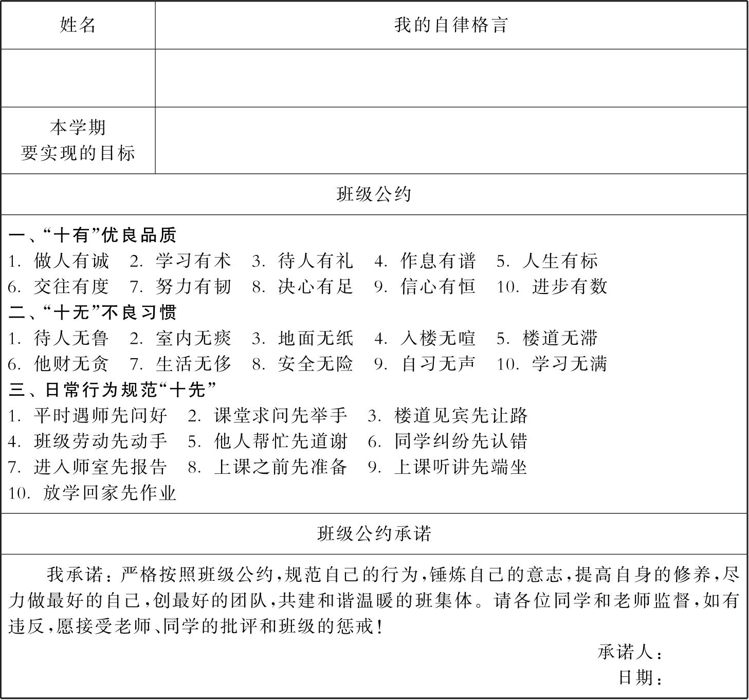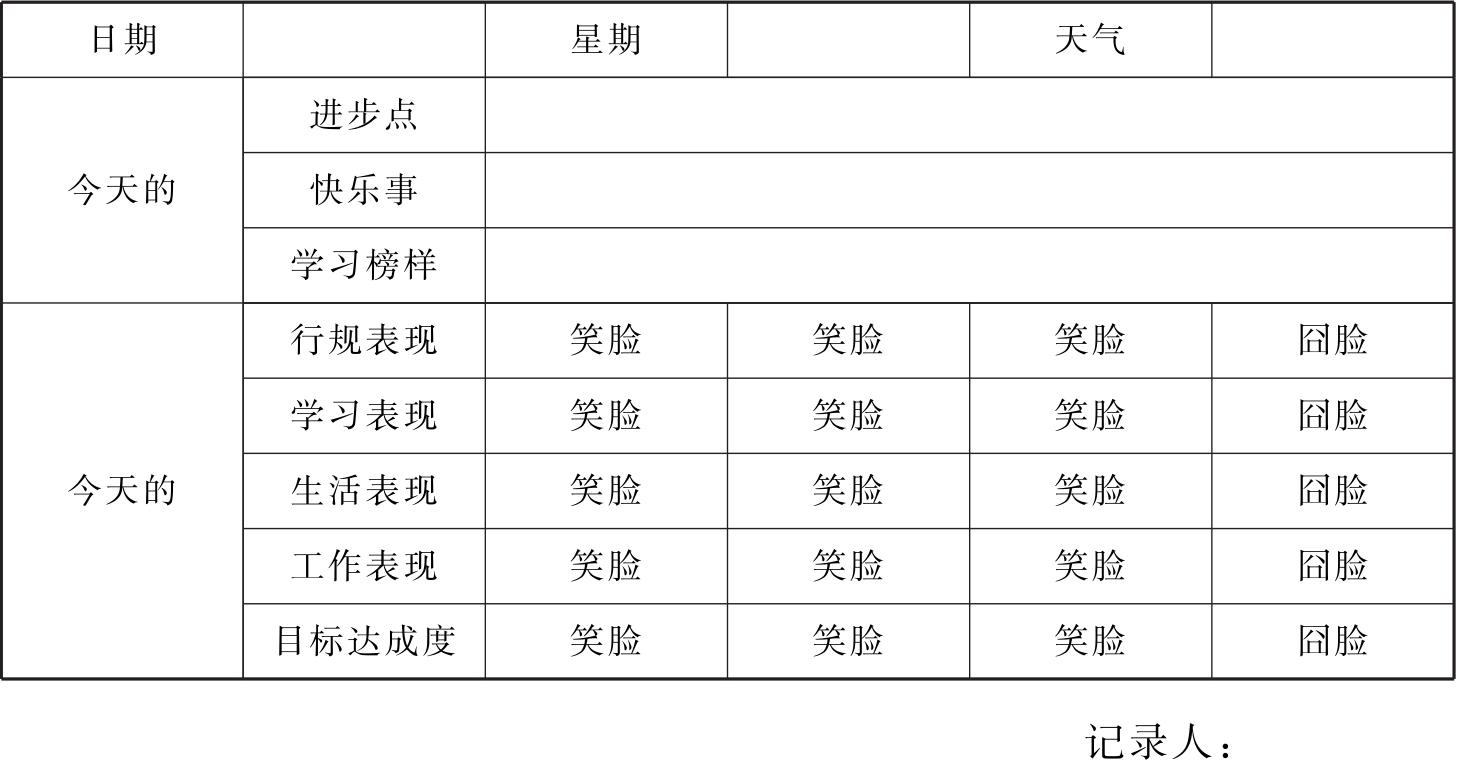 (2)填写成长记录。要求学生每天填写成长记录且“只记进步不记退步,只记快乐不记烦恼”。因为进步和快乐的累积会产生巨大的前行力量,学生每天在自我肯定与教师激励的共同作用下,实现自信自强,主动成长。
