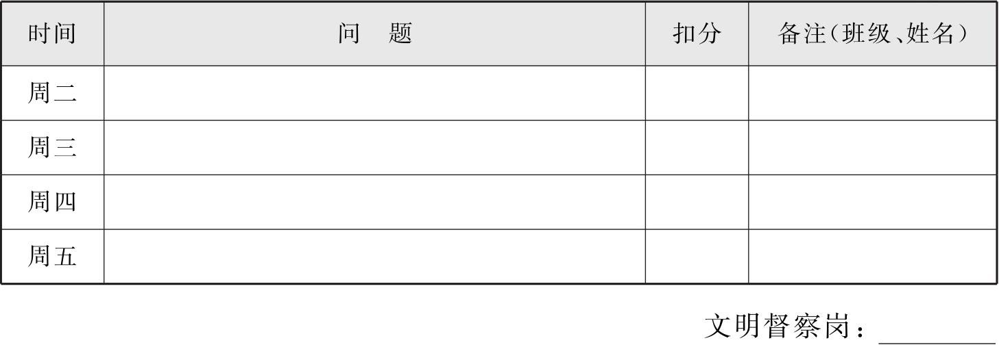 (3)文明礼仪。具体包括:①尊敬师长,团结同学,见到老师要问好。②进办公室要喊报告,未经许可不得入内。③使用文明用语,不说脏话、粗话,不侮辱他人的人格。④不给同学起外号,不直呼老师的名字。⑤尊敬父母,不与父母吵闹,多体谅父母,帮助父母做家务事。⑥关心集体,乐于帮助他人,主动参与公益活动。