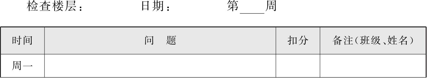 (2)将全班学生划分成若干自理互助小组,每组6~7人。每组推选出一名组长负责对小组内其他同学进行监督、管理,并依照评价标准和考核细则进行加分或扣分。如有扣分,应及时且必须告知本人,并记录清楚扣分原因。如有加分,应记录加分理由,并报班长或副班长审批,给班干部的加分应报班主任批准。由正、副班长负责对小组长的考核。