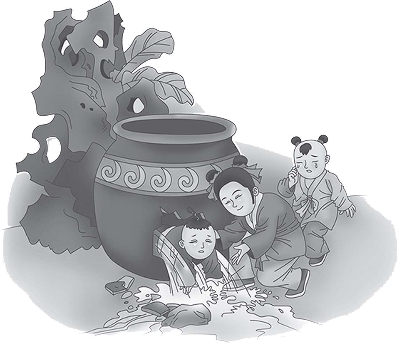 (司马光)和一群小孩子在庭院里玩耍,一个小孩子站在大瓮上面,失足跌落瓮中被水淹没。其他的小孩子都跑了,只有司马光拿石头砸破了瓮,水从破口处涌出,小孩子得以活命。