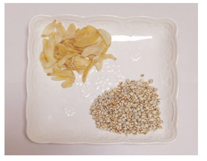 4)食疗方推荐薏苡仁百合汤(图3-4),可清热宣肺祛湿。薏苡仁200g,百合50g。两者放入砂锅内,加水5碗,熬至3碗。